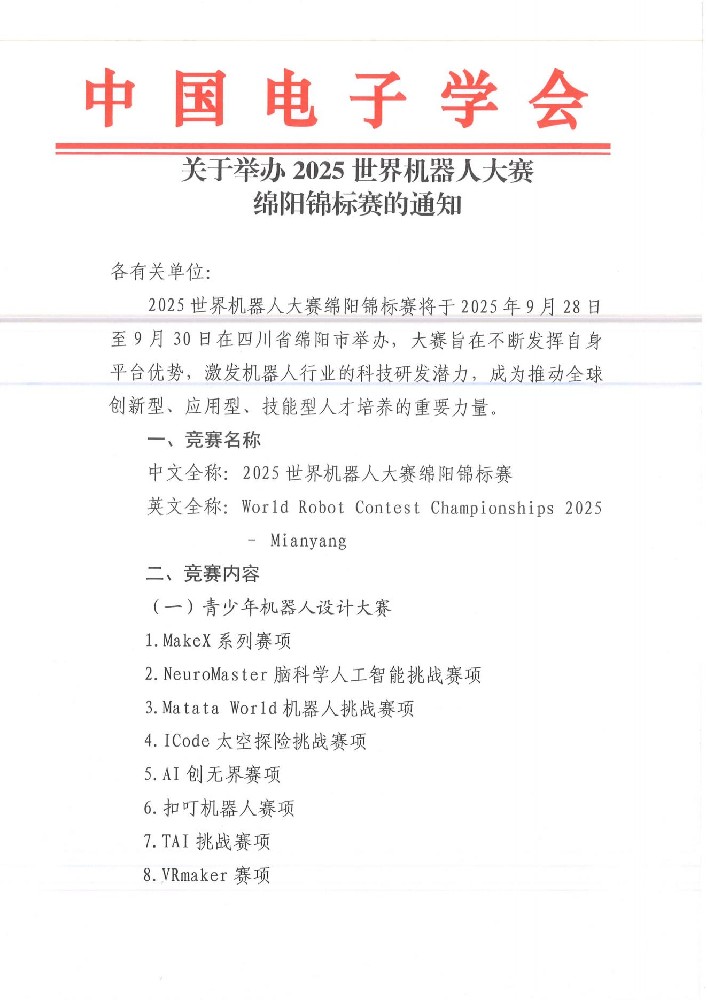 关于举办2025世界机器人大赛绵阳锦标赛的通知