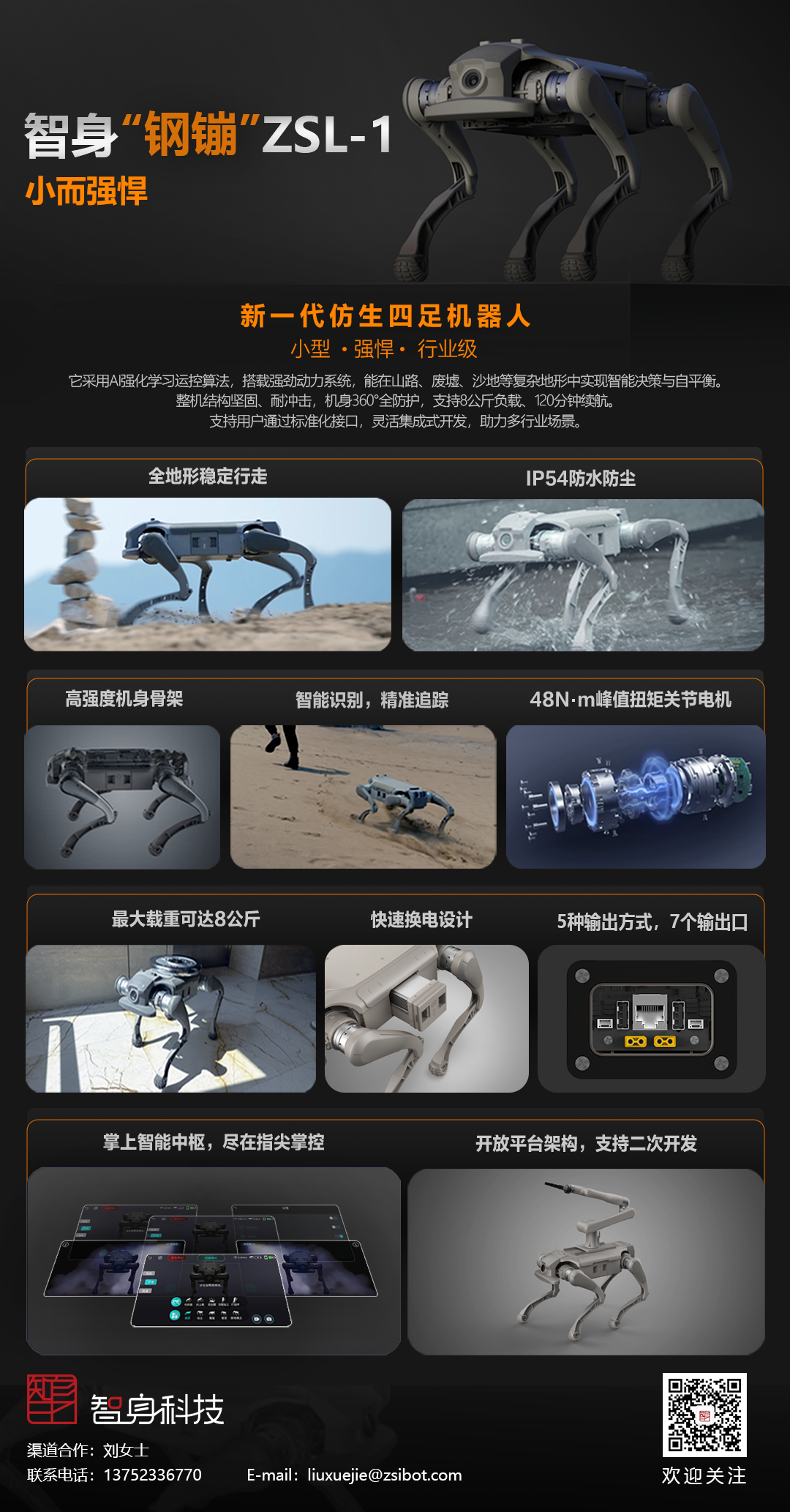 智身“钢镚”ZSL-1 小而强悍 新一代仿生四足机器人 小型·强悍 ·行业级 它采用A强化学习运控算法,搭载强劲动力系统,能在山路、废墟、沙地等复杂地形中实现智能决策与自平衡。 整机结构坚固、耐冲击,机身360“全防护,支持8公斤负载、120分钟续航。 支持用户通过标准化接口,灵活集成式开发,助力多行业场景。